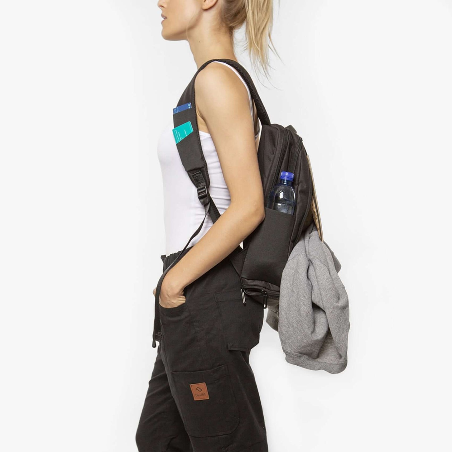 This urban backpack features four elastic pockets to keep your sunglasses and transit card always at hand.